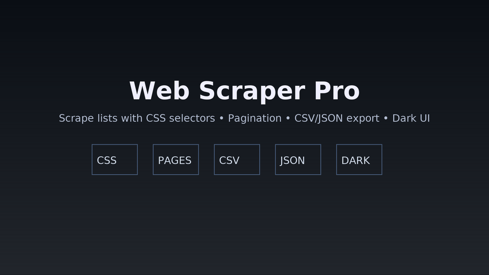 Web Scraper Pro is a self-hosted, premium web application that lets you extract structured data from websites using simple CSS selectors. Point it at a listing page (products, jobs, articles…), tell it how to find each item and the fields you want, and export everything to CSV or JSON in seconds. No database, no cloud dependency — just a fast, lightweight Flask app with a clean dark UI.
