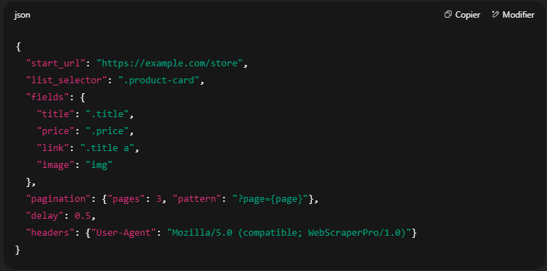 - Paste a JSON config describing where to start and what to extract.